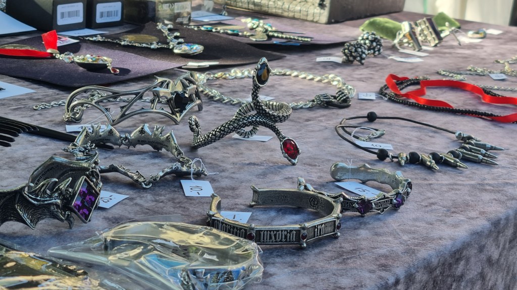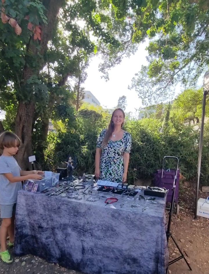 Ja mul on ju draakula ajast hunnik tooteid veel alles, millest juba ammu mõtlesin, et Alchemy Gothic ehted sobiks seal laadal imehästi müüa. Nii et seekord tegimegi ära selle idee ja lõime oma leti ka üles. (päev enne võtsin end kokku ja leppisin korraldajatega kokku, õnneks olid veel mõned viimased vabad kohad alles). Dani oli ka laadal totaalne abimees, oli kassiiriks meil. Lõpus tuli Aleksandr ka (ta nüüd suur ju, võib ise üksi tänavatel liikuda) ja vaatas ja sättis, et väljapanek igati kaunis oleks. Mõlemad igatahes said ägeda kogemuse ja olid rahul. Rahvast oli kui murdu! Ma ei oska isegi öelda, pakuks, et tuhat inimest käis vähemalt läbi. Tuttavaidki trehvasime palju. Dani vana kooli lemmikõps, keda polnud aastaid näinud ja Aleksandri vanad klassikaaslased ühe gootitšikiga, kes endale meilt chokeri skooris ja mitmeid lapsevanemaid koolist ja tööalaseid tuttavaid jne. Kuigi esimene tund tundus mulle, et meie ülialternatiivne lett on ikka liig kohalike jaoks (kuigi väga satanislikud asjad jätsin tegelt ju kaasa võtmata, ikkagi kristlik koht). Siin on ju nii vähe alternatiivi-inimesi või veel vähem gootirahvast. Mõneaastatagune Wednesday seriaal vast tekitas mõne üksiku gootitšiki juurde, aga üldpilt on Hispaanias ikka väga mainstream. Aga siis hakkas kaup järsku kaubaks minema. Keegi ostis isegi suure küünlajala ära. Ja keegi tarokaardid. Ja üks vanem daam küll alguses itsitas oma nooremate sõbrannadega (või tütred olid?), et fuuuh, pealuudega sõrmus! Või issand kui hirmus, ämblikutega kõrvakad! Aga ostis draakoniga juuksepulga nagu naksti kõigile ootamatult ära. Jne jne.